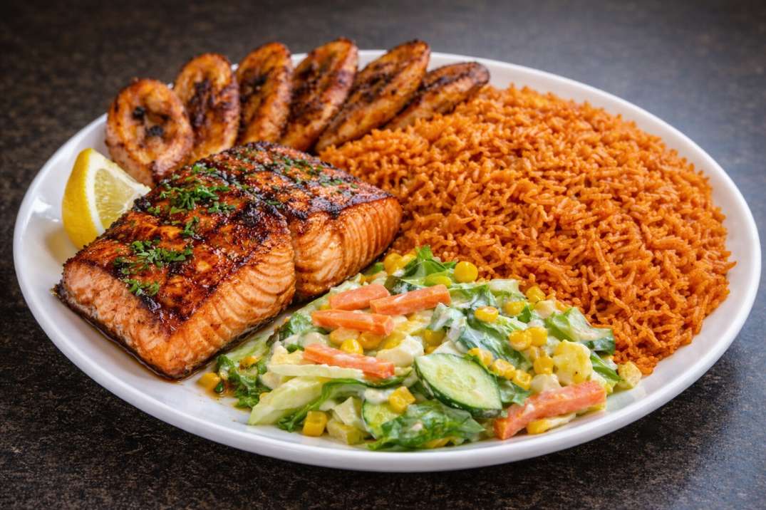 Perfectly grilled salmon fillet, seasoned and slow-simmered in our signature tomato and red bell pepper sauce, served over perfectly cooked long-grain rice infused with rich spices and bold, smoky flavor. Accompanied by golden, sweet fried plantains and a vibrant sauté of fresh spinach and kale, lightly seasoned to complement the richness of the dish. A complete, premium platter that delivers bold flavor, balance, and an elevated dining experience in every bite. Be sure to purchase utensils if you’ll need them (from the Miscellaneous category).